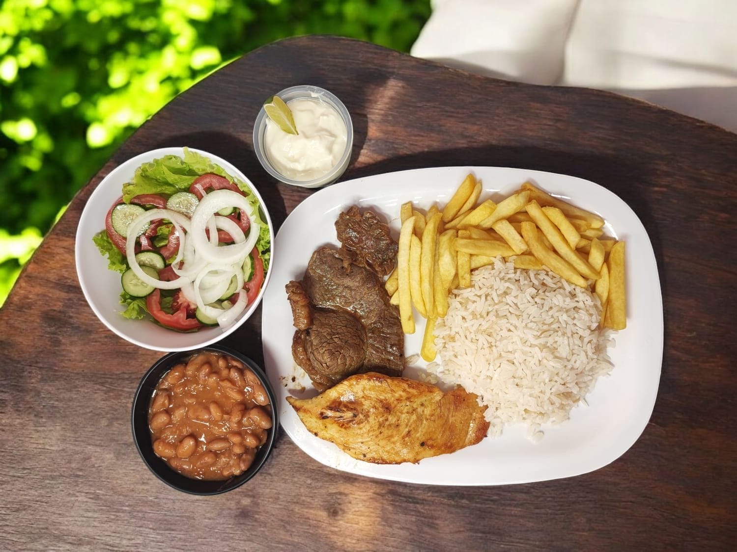 ARROZ LIBANÊS, FEIJÃO RAJADO, BATATAS FRITAS, BIFE DE CONTRA FILÉ, SALADA E UMA SOBREMESA DA CASA.